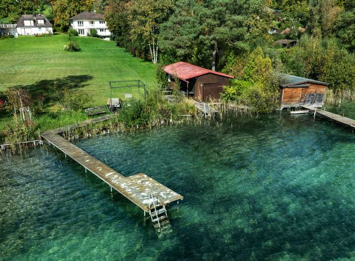Tauchen Sie direkt vom eigenen Steg ins kristallklare Wasser oder genießen Sie eine Bootstour von Ihrem Bootshaus aus. Der atemberaubende Blick auf den See und die idyllische, parkähnliche Umgebung machen dieses Grundstück zu einer echten Oase der Ruhe und Entspannung.