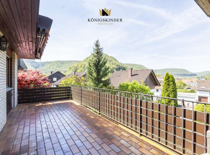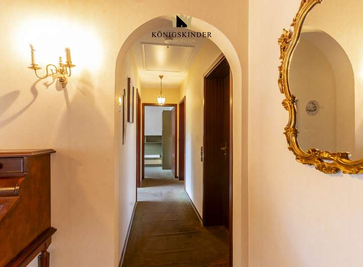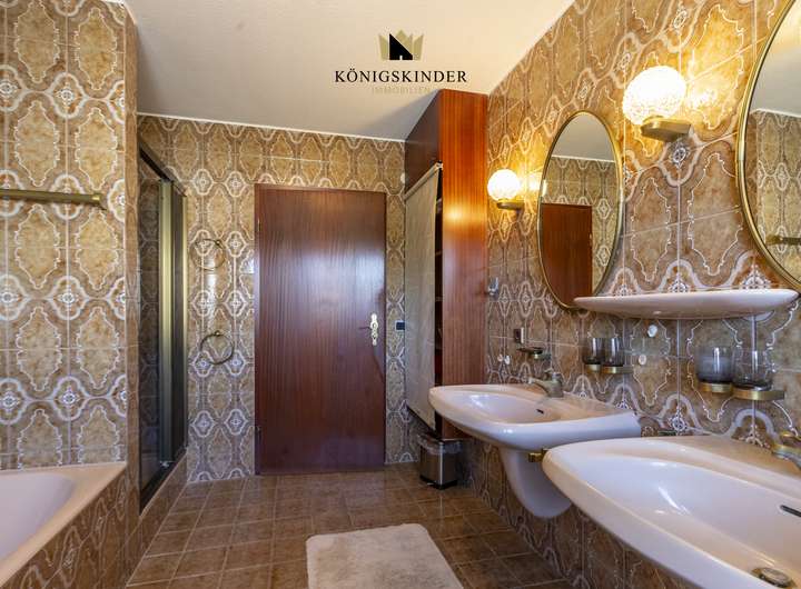 Im Erdgeschoss (Haupwohnung) befinden sich außer dem Windfang mit Garderobe noch 4 - 5 Zimmer. Davon ein Wohnzimmer mit Kaminecke und offenem Durchgang zum Essbereich über die Diele, drei Schlafzimmer, ein Tageslichtbad mit Doppelwaschbecken - Wanne - Dusche und WC, eine Küche mit angrenzendem Hauswirtschaftsraum, sowie ein Gäste-WC. Vom Wohnzimmer aus gelangen Sie auf den nach Südwest ausgerichteten Balkon.