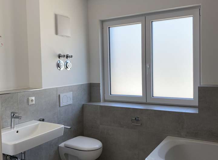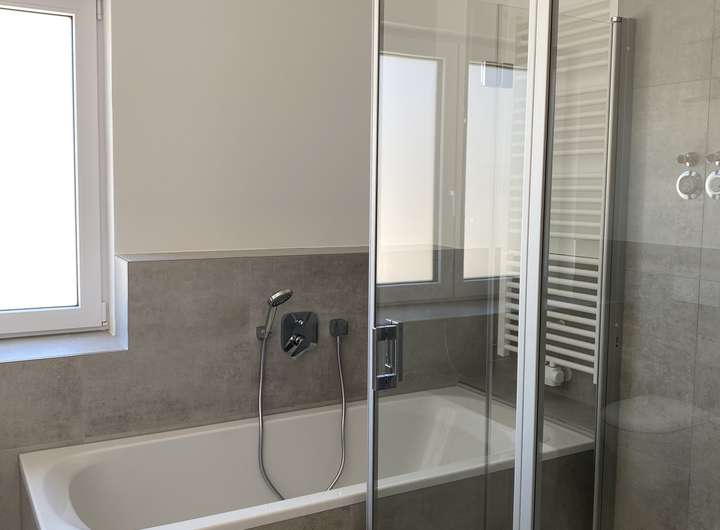Die Ausstattung überzeugt durch hochwertige Holzböden in den Wohnräumen sowie elegante Fliesen in Bad, Gäste-WC und Abstellraum. Das großzügige Tageslichtbad ist mit einer bodengleichen Dusche und einer Badewanne ausgestattet – ideal, um den Tag entspannt zu beginnen oder ausklingen zu lassen. Moderne Deckenspots sorgen dabei für ein stimmungsvolles Lichtkonzept.