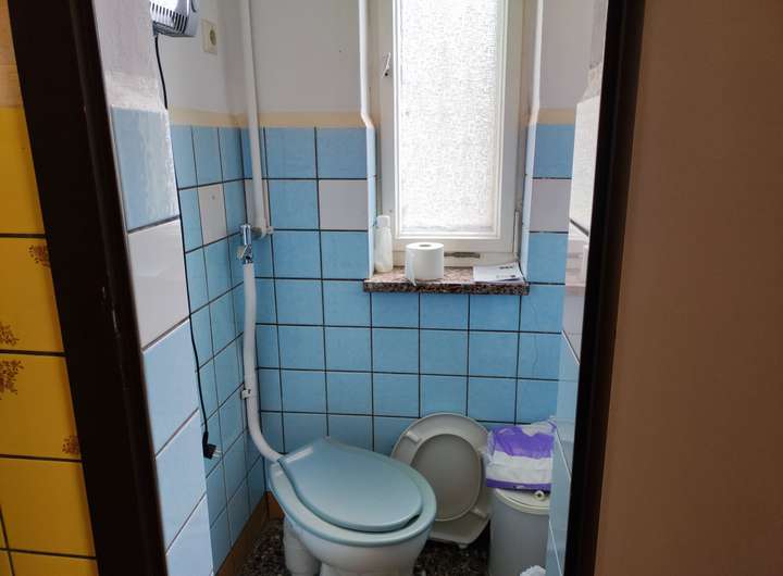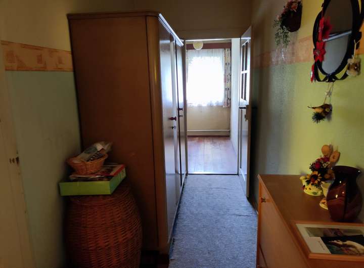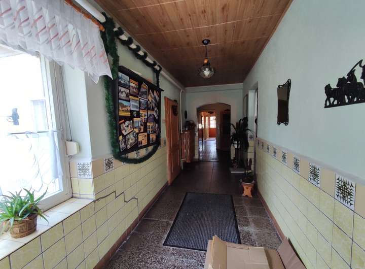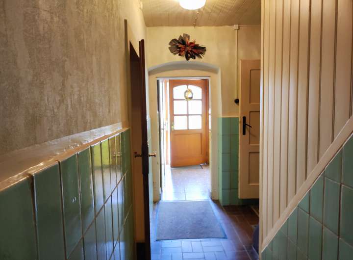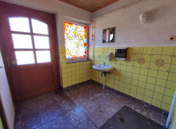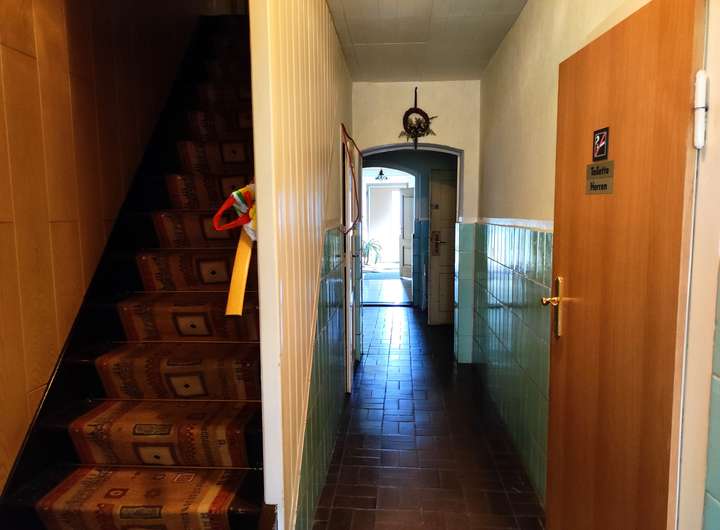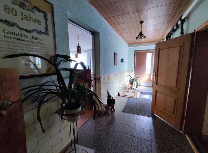 Man betritt das Gebäude über einen kleinen Flur. Hier befinden sich 2 kleine Gästetoiletten. Weiter im Flur befinden sich auf der rechten Seite 2 weitere Gästetoiletten, ein Bad mit neu installierter, ebenerdiger Dusche und Waschtisch und einem Abstellraum mit Zugang zum Garten. Nebendran befindet sich ein weiterer Abstellraum und der Heizungsraum. Hier verrichtet eine Anfang der 90iger Jahre installierte Ölheizung ihren Dienst und versorgt das Gebäude mit Wärme und Warmwasser. Zusätzlich steht eine Mitte der 70iger Jahre errichtete Schwerkraftheizung für Festbrennstoff zur Verfügung. Dahinter befinden sich die Öltanks in einem separatem Raum, welcher nur von Außen zugänglich ist. Ein weiterer Eingang zur Gaststätte befindet sich auf der anderen Seite des Gebäudes. Weiter vom Hauseingang kommend, befinden sich linker Hand 2 Küchen für das Gastgewerbe. In der ersten Küche wurde mit einem alten Ofen gekocht und in der 2. Küche der Abwasch erledigt. Von der Küche besteht Zugang zum 1. Gastraum, in welchem Platz für Tische und Sitzecken ist und sich der Ausschank-Tresen befindet. Weiter geht es in den großen Gastraum, welcher ca. 1975 angebaut wurde und für größere Gesellschaften aber auch für den täglichen Mittagstisch geeignet ist.