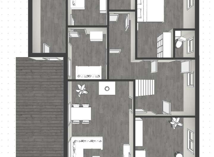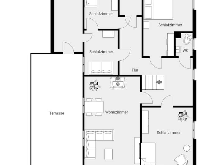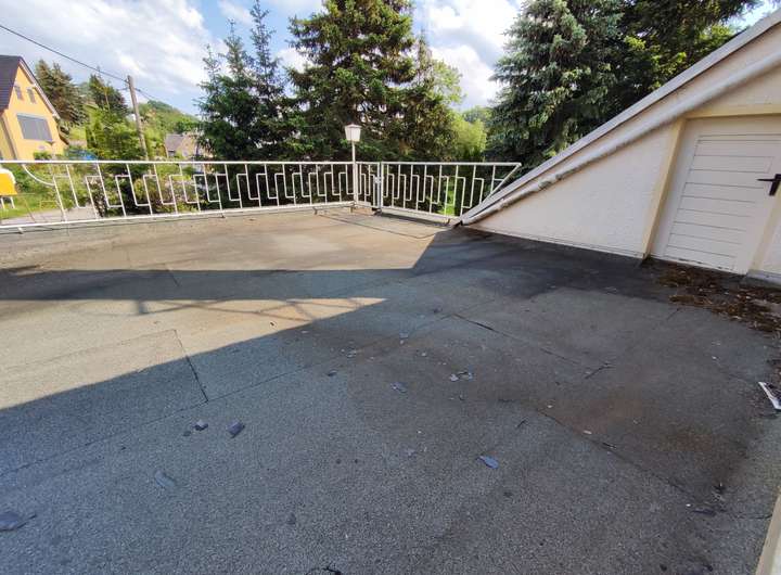 Über eine Holztreppe gelangt man ins Obergeschoss. Vom Flur aus befinden sich hier 2 kleine miteinander verbundene Schlafzimmer mit kleiner Dachkammer, von welcher der Zugang zur großen Dachterrasse möglich ist. Hier könnte man einen separaten Zugang von Außen anbringen und diese als Gastterrasse o.a. nutzen. Ein kleiner Abstellraum, das große Schlafzimmer, eine separate Toilette, ein weiterer Wohn- bzw. Schlafraum und das große, helle Wohnzimmer, welches zusätzlich mit einem Kachelofen für wohlige Wärme sorgt, vervollständigen diese Etage. Da hier kein Badezimmer vorhanden ist, wäre der Einbau eines modernen Bades möglich.