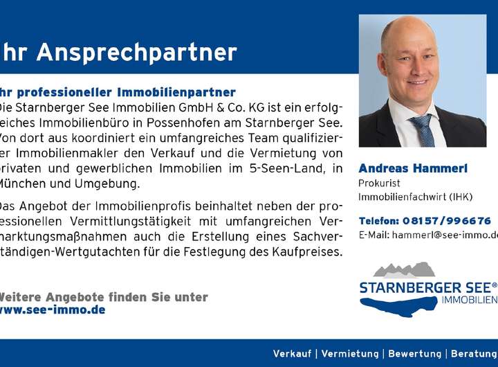 Dann rufen Sie uns doch einfach an - wir versorgen Sie gerne mit weiteren Angaben und laden Sie zu einer umfassenden Besichtigung ein. Ihren Ansprechpartner, Herrn Andreas Hammerl, erreichen Sie unter der direkten Durchwahl 08157 - 99 66 76.