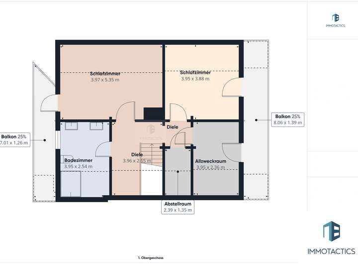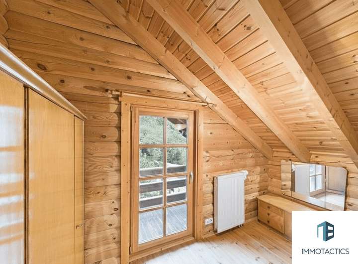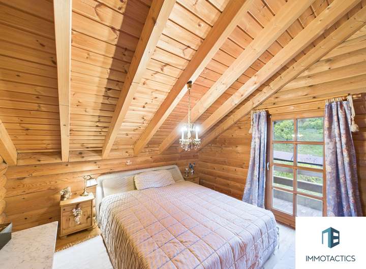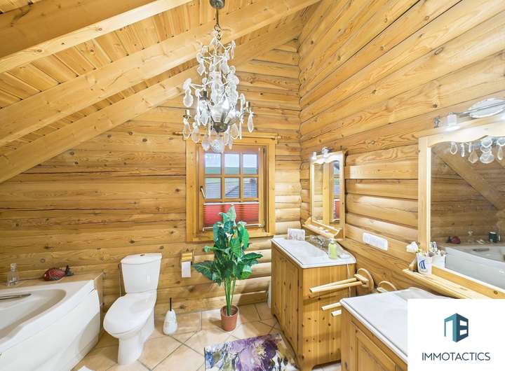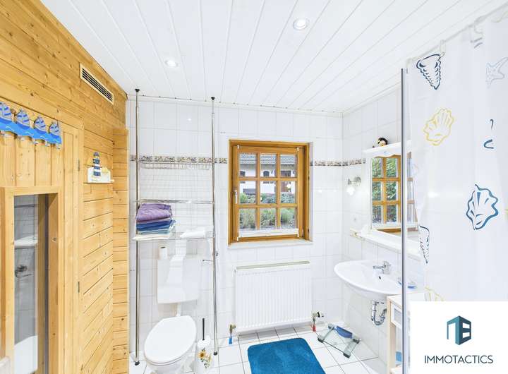 Das Obergeschoss ist den privaten Rückzugsbereichen vorbehalten. Nach hinten liegen zwei Zimmer mit Zugang zu einem Balkon, während nach vorne ein weiteres Zimmer ebenfalls über einen eigenen Balkon verfügt. Die Räume bieten ausreichend Platz für die Familie und lassen sich individuell gestalten. Das geräumige Familienbad mit Doppelwaschbecken und Holzverkleidung schafft eine wohnliche Atmosphäre, die die warme Ausstrahlung des Holzhauses aufgreift. Von den beiden Balkonen aus bietet sich ein schöner Blick über den Garten und die angrenzende Natur.