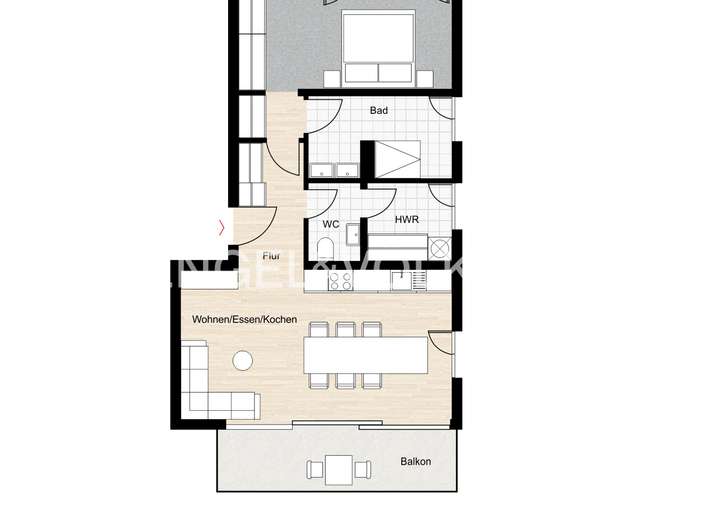 Dank der bodentiefen und großen Fensterelemente ist der gesamte Wohnbereich lichtdurchflutet. Die Wohnung verfügt zudem über ein Badezimmer mit großem Waschtisch und bodengleicher Dusche sowie einen separat gelegenen Hauswirtschaftsraum mit Waschmaschinenanschluss.