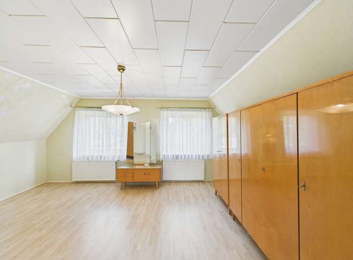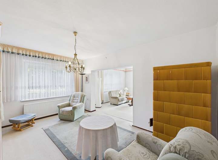Das Wohnhaus verfügt über insgesamt drei Zimmer, darunter zwei geräumige Schlafzimmer, die genügend Platz für den privaten Rückzugsort bieten. Das Herzstück des Hauses ist das helle Wohnzimmer mit gutem Schnitt, das durch große Fenster einen ausgezeichneten Tageslichteinfall erhält und eine freundliche Atmosphäre schafft.
