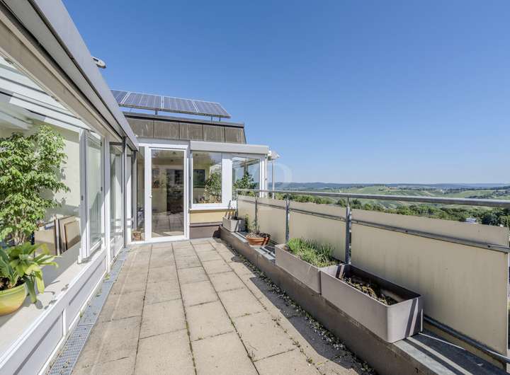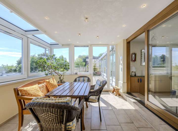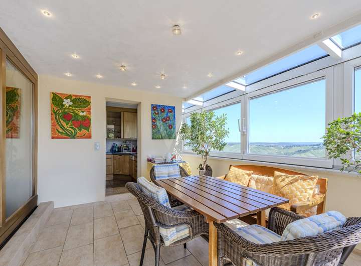 Im Erdgeschoss liegt die private Wohneinheit mit einer Wohnfläche von ca. 210 m². Schon beim Betreten spürt man die Großzügigkeit und Helligkeit dieses Bereichs. Der weitläufige Wohn- und Essbereich mit seinem offenen Grundriss, dem stilvollen Wintergarten und dem Zugang zur überdachten Terrasse ist der Mittelpunkt des Hauses. Hier genießt man zu jeder Tageszeit den traumhaften Ausblick über den Schurwald und erlebt ein besonderes Wohngefühl.