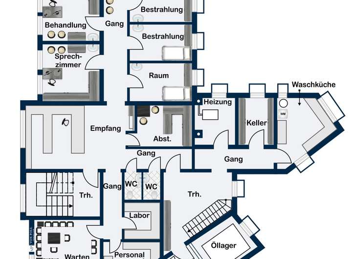 Im Untergeschoss befindet sich die großzügige Arztpraxis, die mit rund 179 m² Nutzfläche ideale Arbeitsbedingungen bietet. Helle Räume, ein durchdachter Grundriss und eine freundliche Atmosphäre schaffen ein angenehmes Umfeld für Patienten und Mitarbeiter. Die Praxis ist durch den Mieter vollständig ausgestattet und seit vielen Jahren zuverlässig vermietet – ein wertvoller Vorteil für Kapitalanleger, die von stabilen Mieteinnahmen und einer langfristigen Nutzung profitieren möchten.