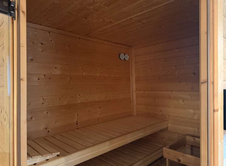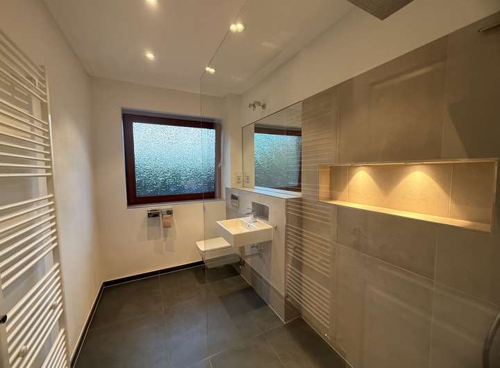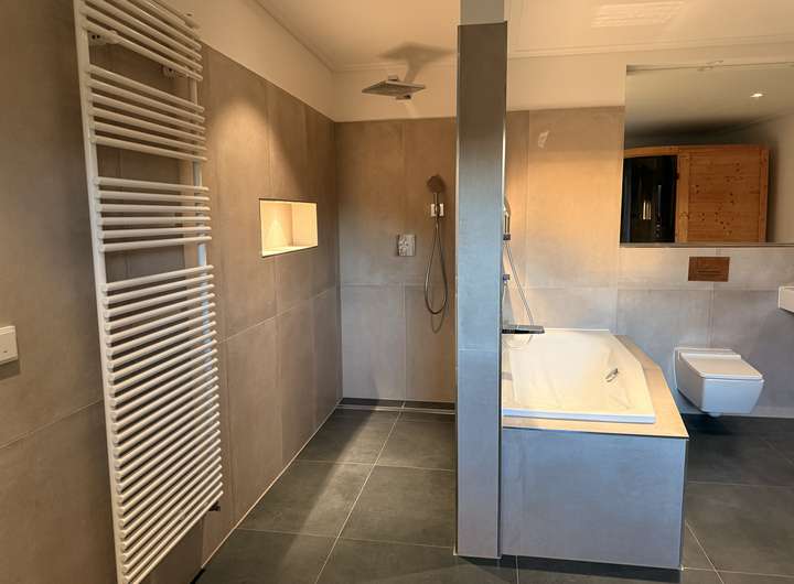 - 2 Badezimmer mit jeweis bodentiefen Duschen. Das Badezimmer neben dem Schlafzimmer ist zusätlich mit einer Badewanne und einer Sauna ausgestattet.