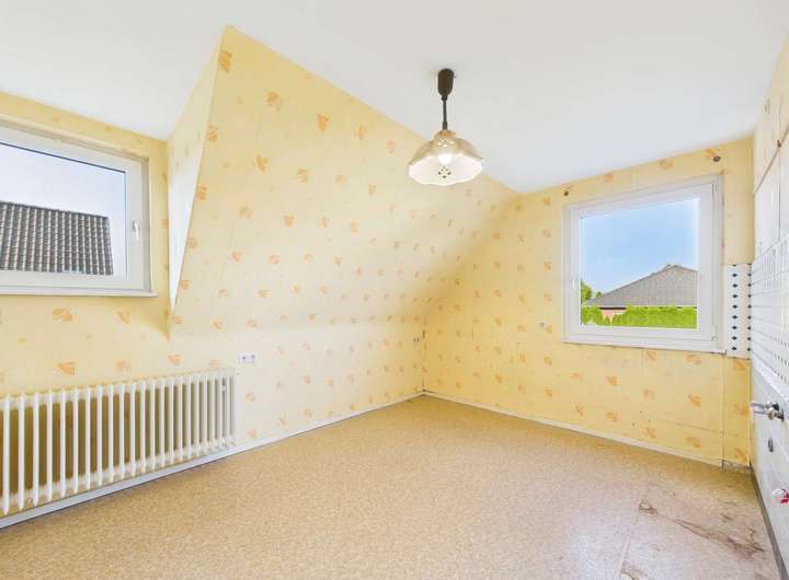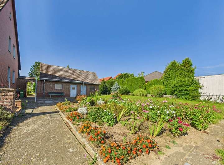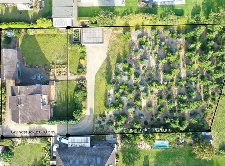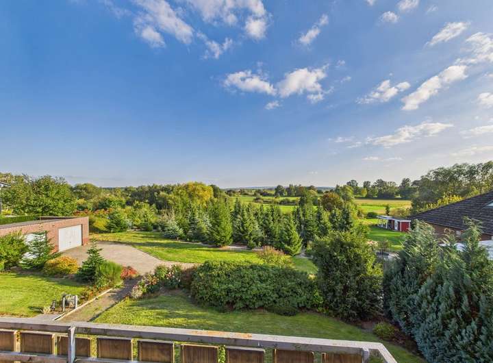Vom Terrasse im Erdgeschoss oder dem Balkon im Obergeschoss hat man eine wunderbare Aussicht auf das 2.678 Quadratmeter große Grundstück. Durch die Lage am Ende einer Anliegerstraße hat man keinen Durchfahrtsverkehr zu befürchten. In Einfahrt und Garage sind Parkmöglichkeiten zudem gewährleistet. Für Gartengeräte, Fahrräder oder auch die eigene Werkstatt ist im Anbau ebenfalls genug Platz. Der gesamte Anbau verfügt zudem über einen geräumigen Dachboden und damit weitere Nutzfläche.