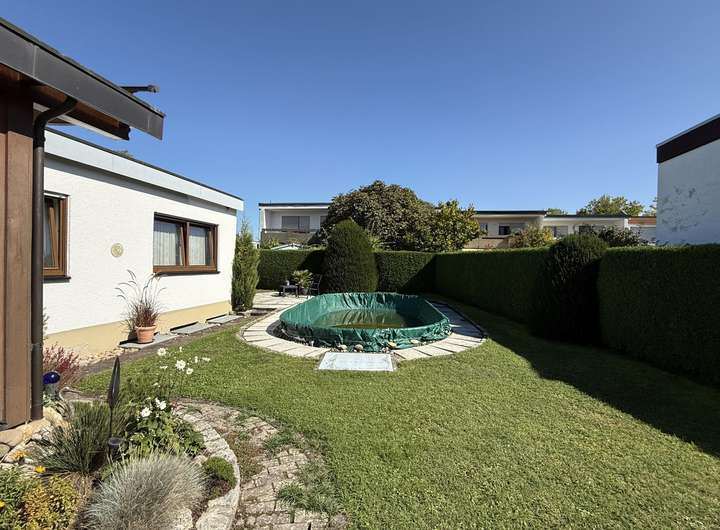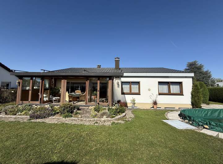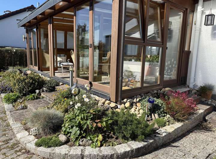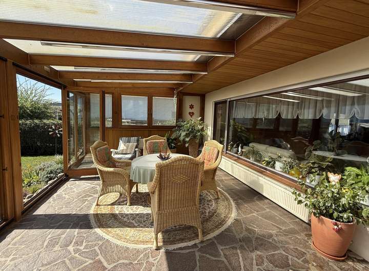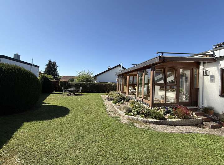 Sie betreten Ihr neues Zuhause über einen großzügigen Eingangsbereich, von wo aus alle Räume zu erreichen sind. Das Herzstück ist der geräumige Wohn-Essbereich mit herrlichem Wintergarten. Die Glaselemente lassen sich größtenteils öffnen, sodass der Charakter einer überdachten Terrasse entsteht. Der große, sehr gepflegte Garten mit Pool bietet viel Platz zum Entspannen und für Kinder den idealen Spielplatz.