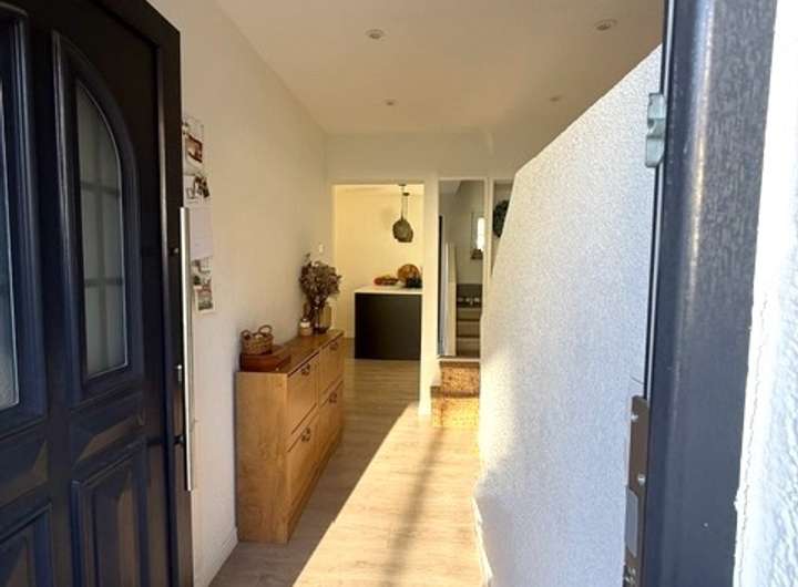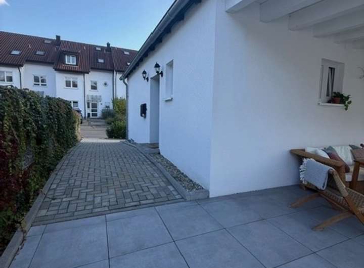dem Hauseingang mit Flur und Gäste WC sowie dem Zugang zur Terrasse mit Gartenbereich.