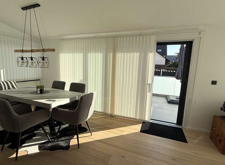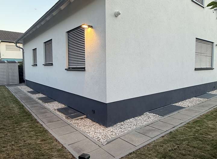 Das Erdgeschoss empfängt Sie mit einem großzügigen, offenen Grundriss. Die moderne Küche fügt sich harmonisch in den lichtdurchfluteten Wohn- und Essbereich ein. Dank bodentiefer Fenster mit elektrisch steuerbaren Raffstores (Z-Lamellen) der Marke ROMA genießen Sie nicht nur viel Tageslicht, sondern auch höchsten Bedienkomfort und Sichtschutz.