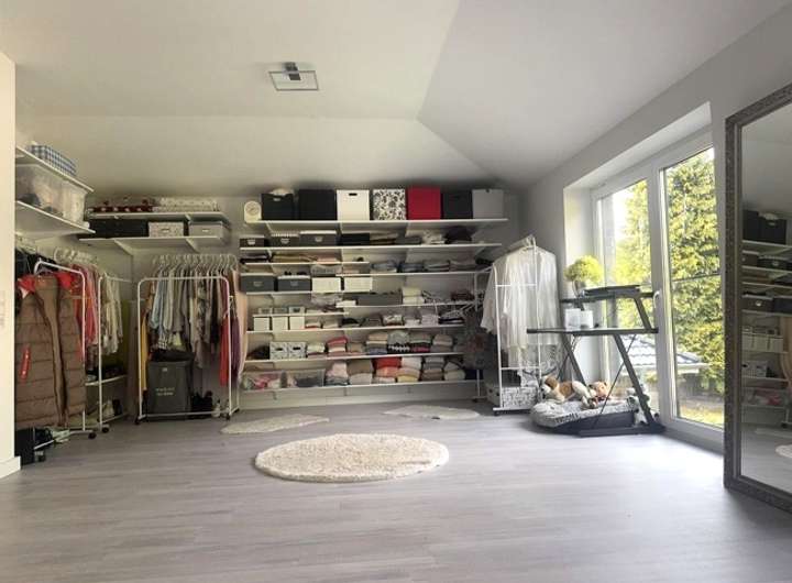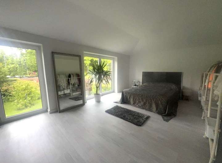 Das Obergeschoss bietet ein eindrucksvolles, ca. 40 m² großes Schlafzimmer mit Gartenblick und ein stilvolles Vollbad mit Walk-In Dusche. Einheitliche Laminatböden verleihen den Räumen ein ruhiges, warmes Ambiente.