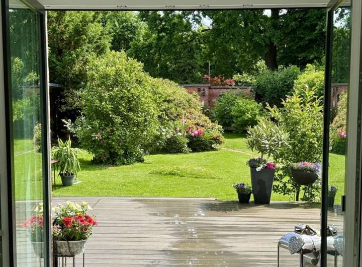 Der Garten ist ein echtes Highlight: liebevoll angelegt, üppig bepflanzt und perfekt gepflegt. Ein eigener Brunnen sorgt für die Bewässerung und macht die Gartenpflege auch in den Sommermonaten unkompliziert. Hier entsteht ein Rückzugsort, der Erholung und Entspannung bietet – sei es beim Spielen der Kinder, beim Gärtnern oder auf der großen Sonnenterrasse.