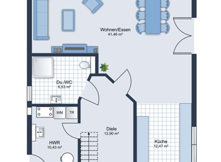 Im Erdgeschoss eröffnet sich ein ca. 54 m² großer Wohn- und Essbereich mit hochwertiger Einbauküche und Marken-Elektrogeräten. Eine versenkbare Dunstabzugshaube, elektrische Jalousien sowie die durchgehende Fußbodenheizung unterstreichen den hohen Wohnstandard. Ergänzt wird das Erdgeschoss durch ein modernes Duschbad, einen funktionalen Hauswirtschaftsraum mit Außenzugang sowie eine einladende Diele.