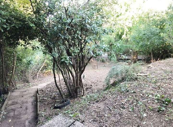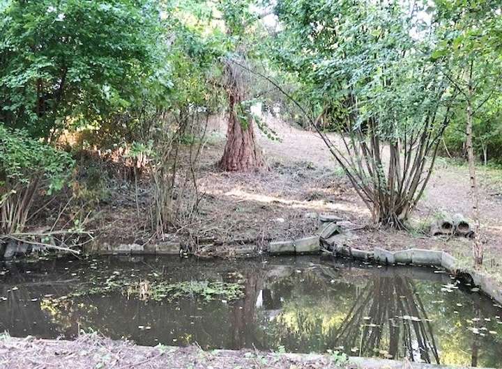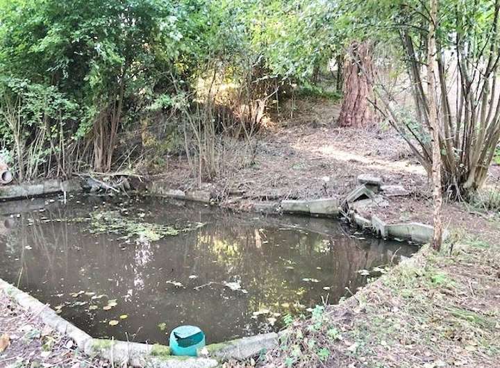 Naturbelassenes Gelände mit altem Baumbestand und einem Gartenteich mit Ablaufsystem