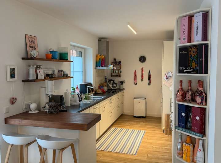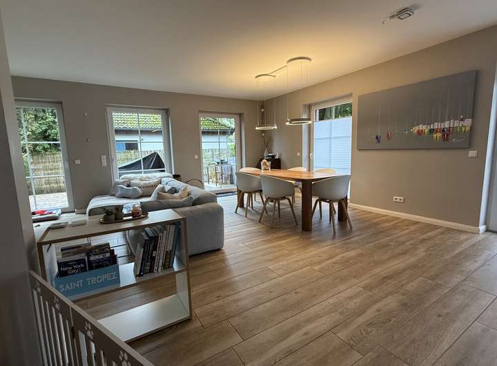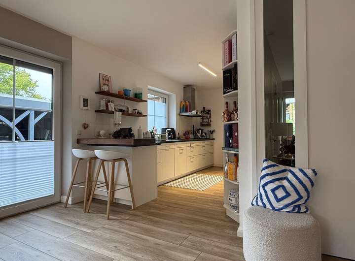 Die im holländischen Landhausstil errichtete Immobilie überzeugt durch eine durchdachte Raumaufteilung auf mehreren Ebenen. Im Erdgeschoss erwartet Sie ein großzügiger, lichtdurchfluteter Wohn- / Essbereich mit offener Küche. Die stilvolle Küche ist mit allen notwendigen Elektrogeräten ausgestattet und fügt sich harmonisch in den offenen Grundriss ein – perfekt für gesellige Abende mit Familie und Freunden.