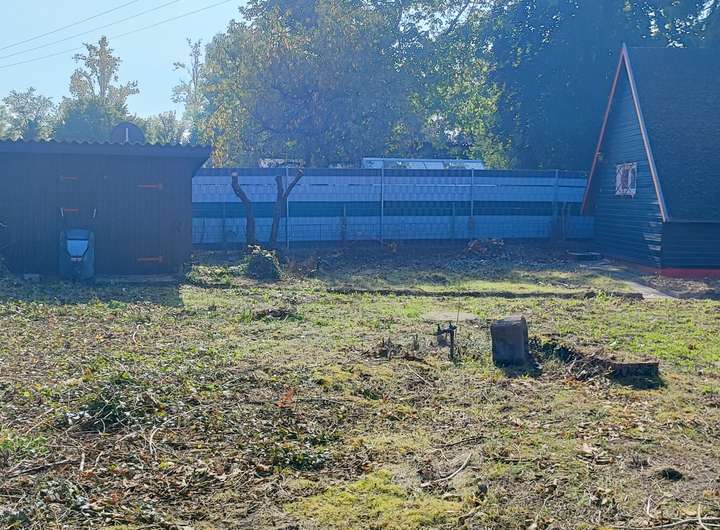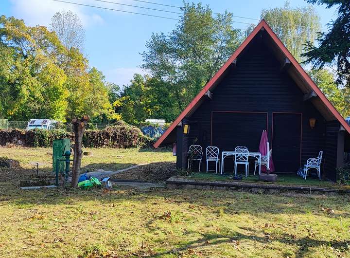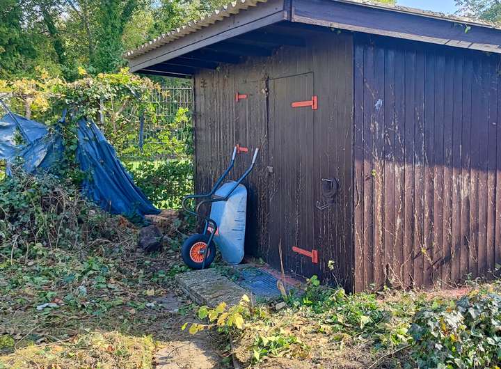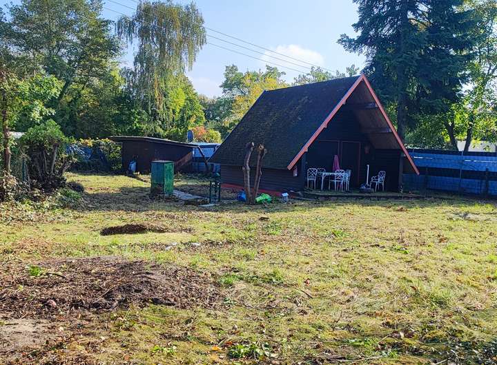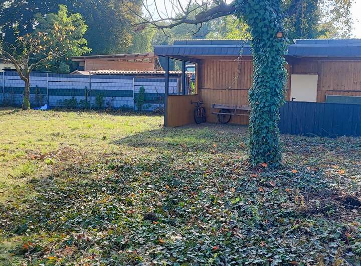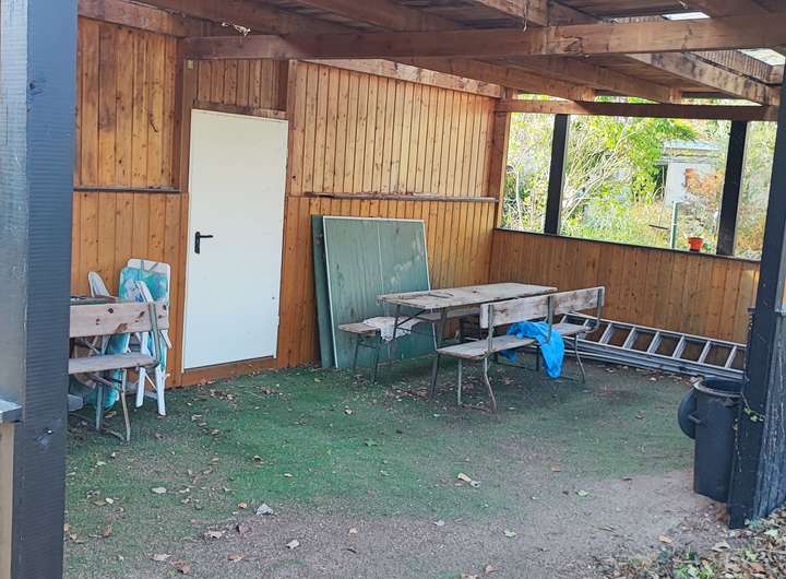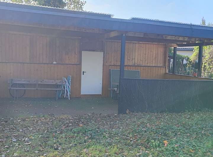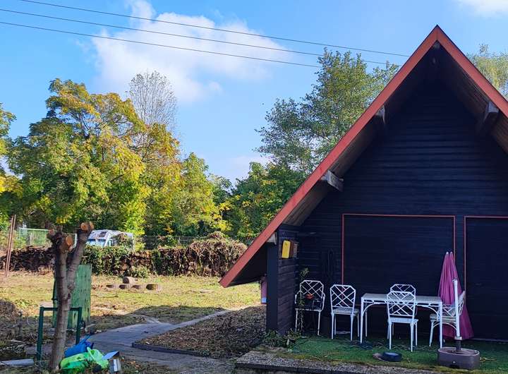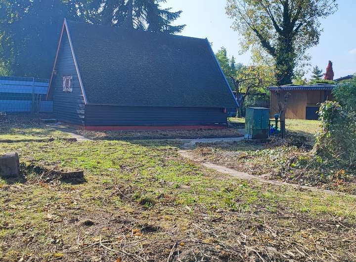 Auf dem großen Grundstück befindet sich ein robustes Holzhaus mit eingerichteter Küche und Veranda (Wohnfläche ca. 26 m²) sowie ein großer Schuppen mit Tageslichtfenster und großer Veranda.