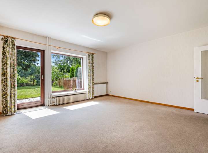 • Wohn-/Esszimmer, Teppichboden, große Fensterfront, Zugang auf die Terrasse und in den Garten