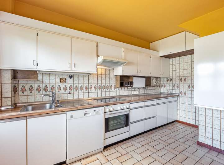 • geräumige Küche, beige gefliest, mit beigen, hellen Fronten, Herd, Geschirrspüler, ohne Kühlschrank