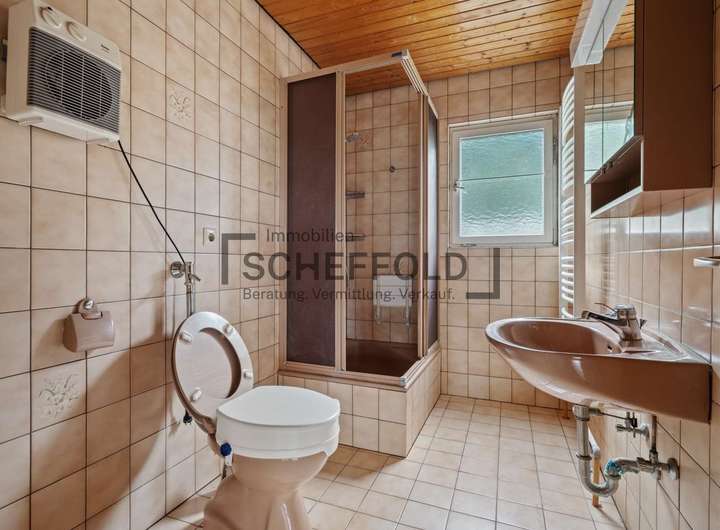 Das Badezimmer ist entsprechend dem Baujahr mit einer Dusche, einem Waschbecken und einem WC ausgestattet – eine solide Grundlage, die durch eine moderne Sanierung in eine persönliche Wohlfühloase verwandelt werden kann.