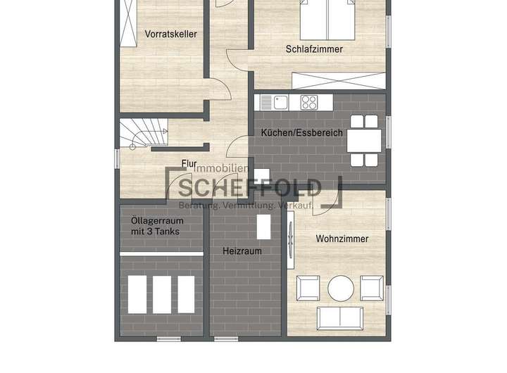 Darüber hinaus finden Sie im Untergeschoss neben dem Heizraum und dem Öllager, einen praktischen Vorratskeller, der für Ordnung und Stauraum sorgt.