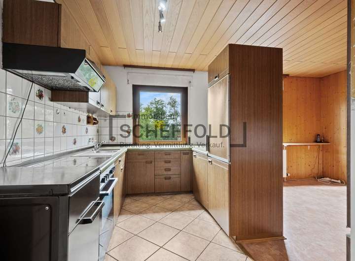 Den Auftakt bildet die komfortable, vom Wohnbereich abgetrennte Küche, welche aktuell mit einer Einbauküche älteren Baujahrs ausgestattet ist. Sie bietet genügend Platz für eine moderne Neugestaltung und lässt sich wunderbar an heutige Wohn- und Kochbedürfnisse anpassen. Direkt angrenzend befindet sich der Essbereich, der kurze Wege ermöglicht und sich als geselliger Mittelpunkt für gemeinsame Mahlzeiten anbietet.