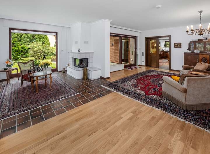 *ansprechender und großzügiger Wohnbereich mit Kamin