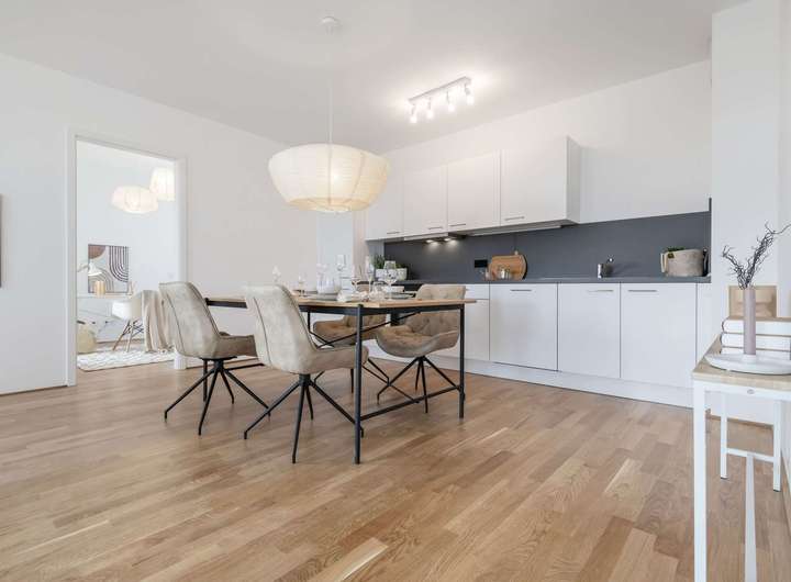 Die Ausstattung lässt keine Wünsche offen: Hochwertiges Eiche-Echtholzparkett, Fußbodenheizung mit Free-Cooling-Technologie und elegante Feinsteinzeugfliesen in den Bädern schaffen ein Ambiente zum Wohlfühlen. Teilweise bodentiefe Fenster sorgen für lichtdurchflutete Räume, elektrische Rollläden und schwellenfreie Zugänge garantieren höchsten Komfort. Ein Aufzug, Kellerabteile sowie PKW- und Fahrradstellplätze sind selbstverständlich Teil des Angebots.