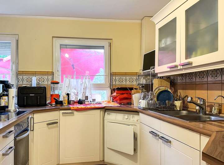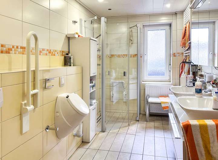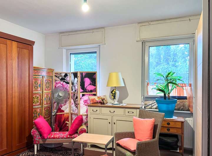 Das zweite, etwa 1920 erbaute Wohnhaus mit ca. 220 m² Wohnfläche dient derzeit als Hauptgebäude der Eigentümer, ein sehr sympathisches, älteres Ehepaar, das sich aus gesundheitlichen Gründen verkleinern möchte. Das Haus beeindruckt mit schönen Altbaudetails, einer verzierten Fassade und einer parkähnlich angelegten Zufahrt. Im Erdgeschoss finden sich helle Wohnräume mit Parkettboden, eine Küche mit Vorratskammer sowie ein großzügiges, bereits altersgerecht modernisiertes Bad. Der gesamte Bereich im Erdgeschoss ist zudem mit Jalousien ausgestattet. Im Obergeschoss stehen weitere Zimmer zur Verfügung, die hauptsächlich als Abstellflächen genutzt werden.