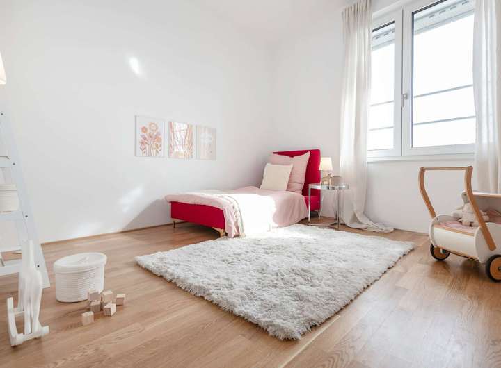 - Edles Eiche-Echtholzparkett & großformatige Feinsteinzeugfliesen