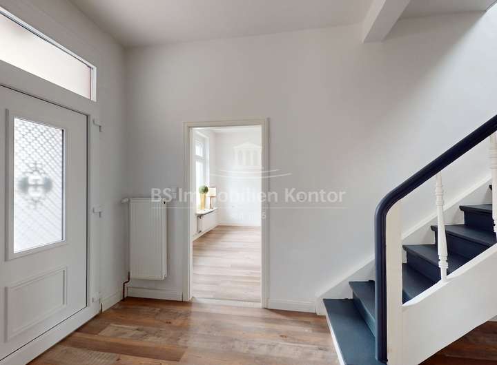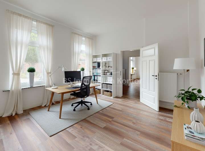 Inmitten des ostfriesischen Landkreises Leer, im idyllischen Ort Bunde, präsentiert sich dieses charmante Stadthaus aus dem Jahr 1895 als echte Rarität mit vielseitigen Nutzungsmöglichkeiten. Die Immobilie wurde umfassend saniert und mit viel Liebe zum Detail aufwendig renoviert. Im Jahr 2020 wurde der Dachstuhl vollständig erneuert, inklusive moderner Dämmung und neuer Dacheindeckung. Besonderes Augenmerk wurde darauf gelegt, den historischen Charme des Gebäudes stilvoll mit zeitgemäßen Elementen zu verbinden. So ist ein harmonisches Wohnambiente entstanden, das klassischen Charakter mit modernem Wohnkomfort vereint. Die Immobilie verfügt über eine Wohn- und Nutzfläche von ca. 169,9m², verteilt auf zwei Etagen. Im Erdgeschoss befinden sich ein einladender Flur mit Diele, ein offener Wohn- und Essbereich, ein Schlafzimmer bzw. Büro, eine Küche, ein Badezimmer sowie ein Hauswirtschaftsraum mit angrenzender Garage. Das Dachgeschoss bietet vier weitere Zimmer, wovon eines als Durchgangszimmer genutzt wird. Helle, großzügig geschnittene Wohnräume und eine geschmackvolle Ausstattung verleihen der Immobilie ein besonderes Wohngefühl. Beheizt wird das Haus über eine moderne Gas-Zentralheizung aus dem Baujahr 2018. Dieses Stadthaus vereint historische Substanz mit moderner Wohnqualität und eignet sich ideal sowohl für Familien als auch für individuelle Wohnkonzepte.