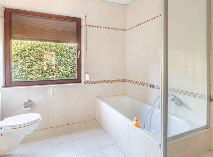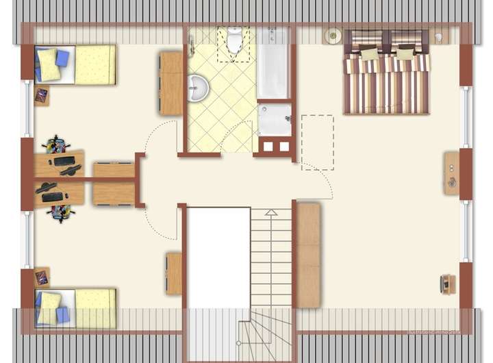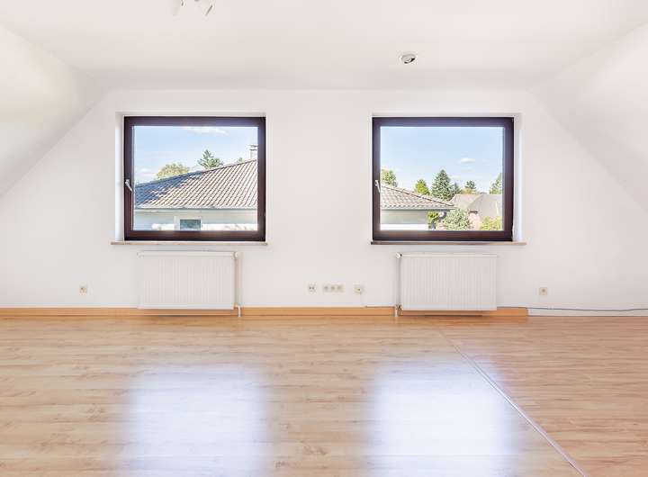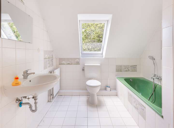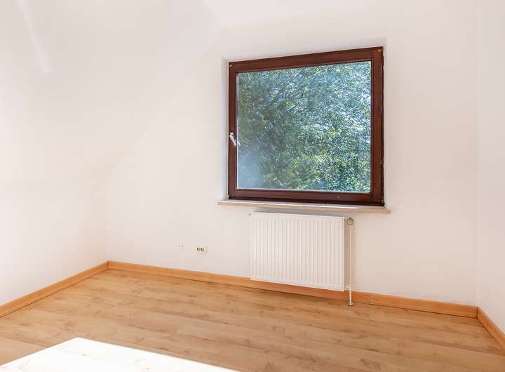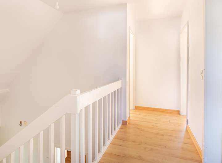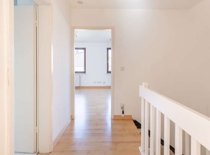 Über eine helle Holztreppe erreichen Sie das Obergeschoss. Hier teilen sich zwei gleich große Kinderzimmer, ein weiteres hell gefliestes Vollbad mit Fenster und Dusche sowie das sehr große und lichtdurchflutete Schlafzimmer auf.