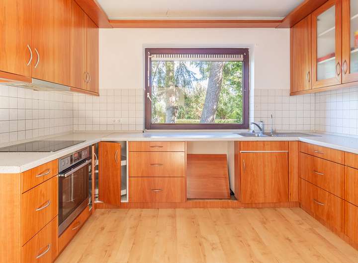 Die direkt an das Wohn- und Esszimmer angrenzende und von der Eingangsdiele aus zugängliche Küche ist mit einer attraktiven Einbauküche im hellen Holzdekor mit zahlreichen Ober- und Unterschränken und den erforderlichen Elektrogeräten ausgestattet. Des Weiteren befinden sich im Erdgeschoss noch das hell geflieste Vollbad mit Fenster und zusätzlicher Dusche sowie die Garderobenecke und zwei gut geschnittene Schlaf-/ Gäste- oder Arbeitszimmer.