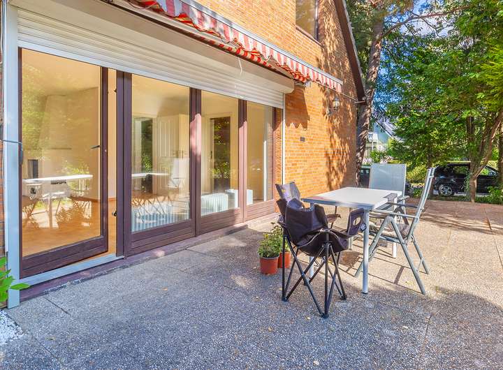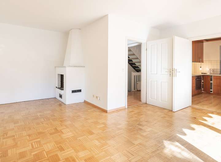 Lebensmittelpunkt des Haupthauses stellt das Wohn- und Esszimmer dar, welches neben großen Fensterelementen über einen gemütlichen, offenen Kamin verfügt. Direkt begehbar ist von hieraus die davorliegende Süd-Terrasse, die zum Verweilen im Freien einlädt.