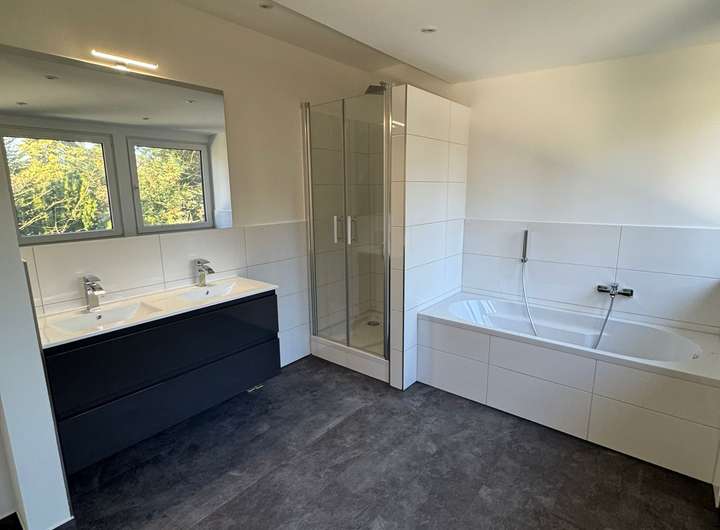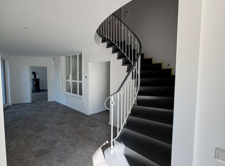 Die Wohnfläche von ca. 250 m² plus 30 m² Nutzfläche verteilt sich im Erdgeschoss auf 4 Zimmer, Küche, Duschbad, Gäste-WC und Wintergarten (= 30 m² Nutzfläche). Im Obergeschoss befinden sich 2 weitere Räume sowie ein Vollbad mit Badewanne und einer zusätzlichen separaten Dusche. Ein weiteres Zimmer mit begehbarem Schrank befindet sich im Souterrain. Ferner gibt es eine Garage für einen PKW sowie 2 weitere Stellplätze, deren Kosten im Mietpreis enthalten sind.