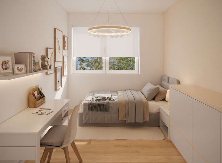 Die Wohnung verfügt über ein Schlafzimmer, ein Kinder-/Arbeitszimmer sowie ein hochwertig ausgestattetes Badezimmer.
