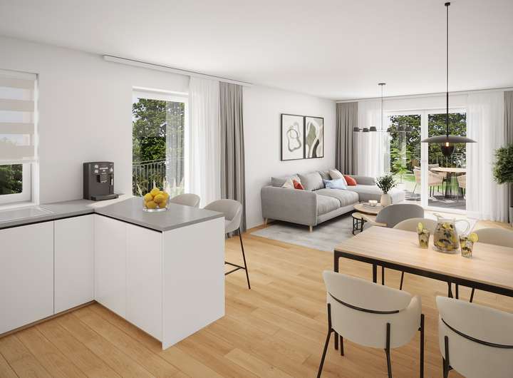 Die Wohnung besticht durch offene, helle Räume, einen durchdachten Grundriss sowie einen Balkon.
