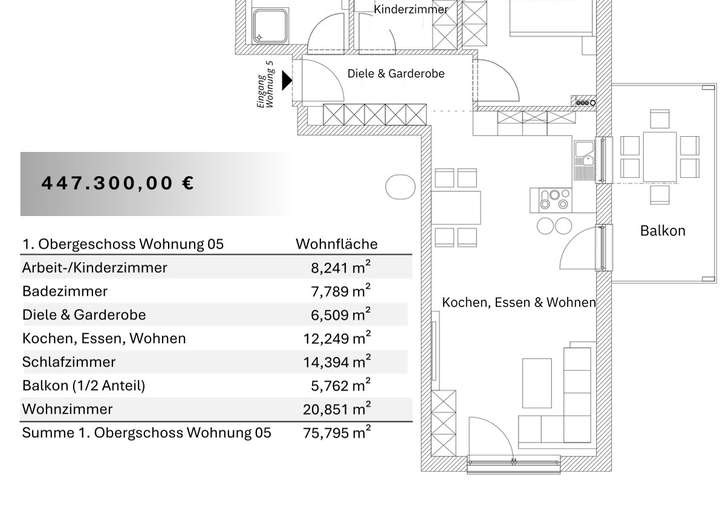 Die Wohnfläche beträgt 75,80 m² und verteilt sich auf einen großzügigen, lichtdurchflutenden Koch-Ess-Wohnbereich mit direktem Zugang zum Balkon.