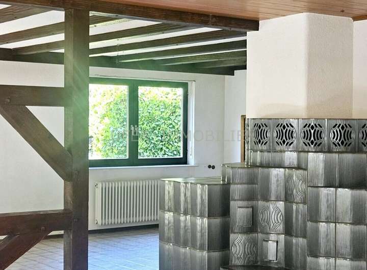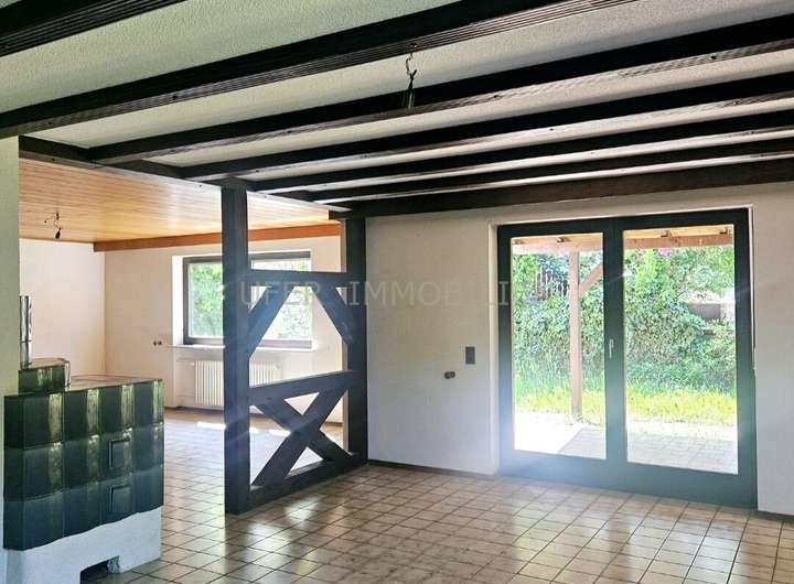 - EG: Eingang / Foyer mit Verbindung zum 1 OG, lichtdurchfluteter Wohnbereich mit Fachwerk Teiler, Kachelofen, Zugang auf die überdachte Terrasse mit Blick in den Garten, Küche, Gäste WC, Abstellkammer.