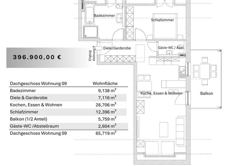 Die Wohnung besticht durch offene, helle Räume, einen durchdachten Grundriss sowie einen Balkon.