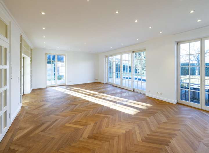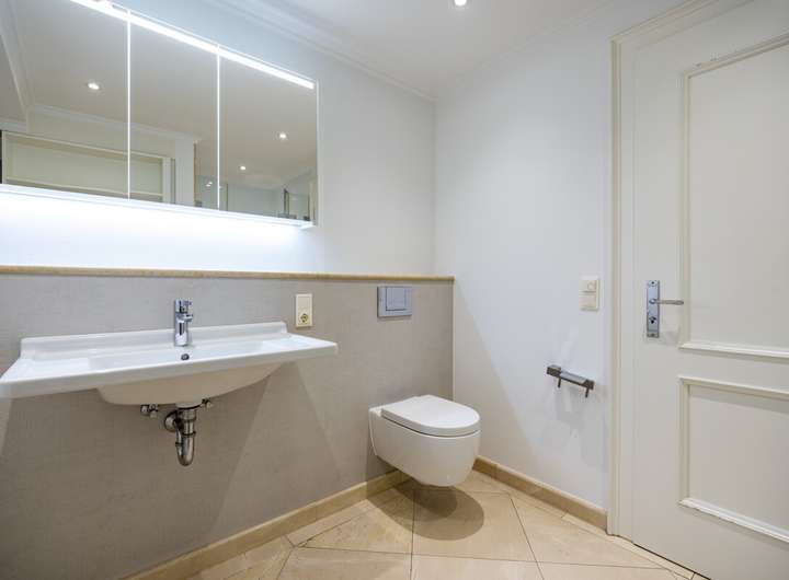 Die Innenausstattung dieser Immobilie überzeugt durch eine sorgfältige Auswahl exklusiver Materialien und eine stimmige Gestaltung bis ins Detail. Großformatige Natursteinfliesen und edles Eichen-Fischgrätparkett schaffen eine stilvolle Verbindung aus Eleganz und Wohnlichkeit. LED-Deckenleuchten sorgen in allen Räumen für eine moderne, energieeffiziente Beleuchtung.