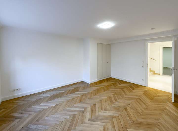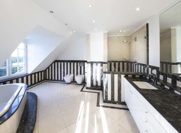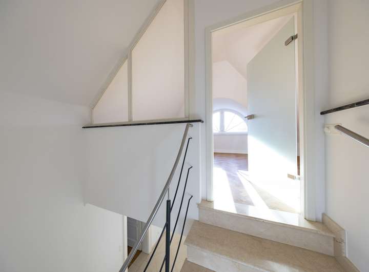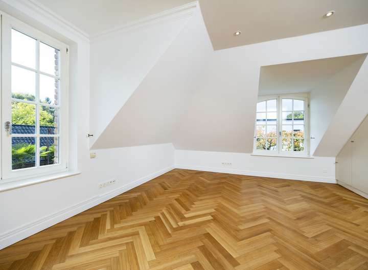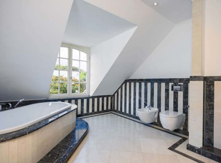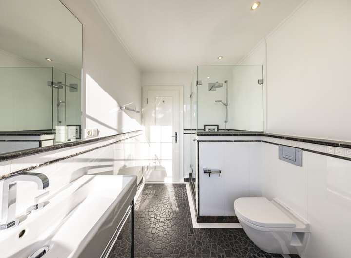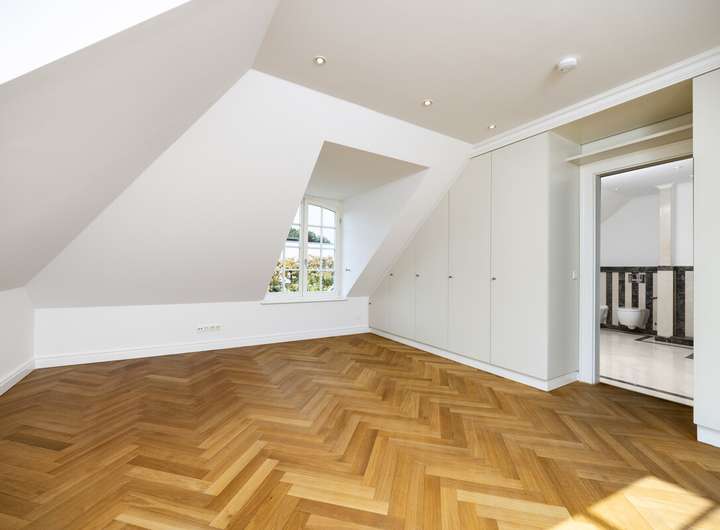 Die ca. 290 m² Wohnfläche verteilen sich auf sieben Zimmer. Im Obergeschoss befinden sich drei Schlafzimmer, im ausgebauten Dachgeschoss ein Studiozimmer – ideal als Rückzugsort oder kreativer Arbeitsbereich. Im Untergeschoss stehen zwei weitere Tageslichträume flexibel als Gästezimmer, Hobbyräume oder Homeoffice bereit. Drei luxuriös gestaltete Tageslicht-Bäder mit modernem Design, edlen Naturstein-Elementen und hochwertigen Armaturen sowie ein zusätzliches Gäste-WC im Erdgeschoss ergänzen die exklusive Ausstattung.
