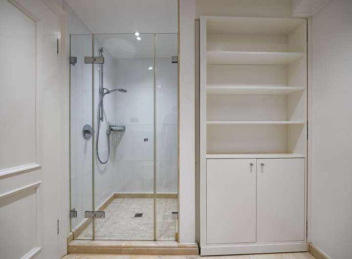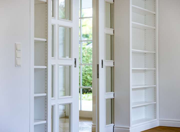 Maßgefertigte Einbauschränke in den Schlafzimmern sowie integrierte Regale im Wohnbereich bieten nicht nur viel Stauraum, sondern unterstreichen den hohen gestalterischen Anspruch. Die Fenster sind mit elektrischen Rollläden ausgestattet, die sich bequem per App steuern lassen – ein Plus an Komfort und Sicherheit.