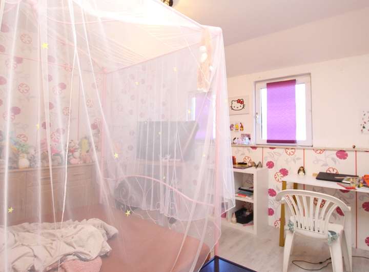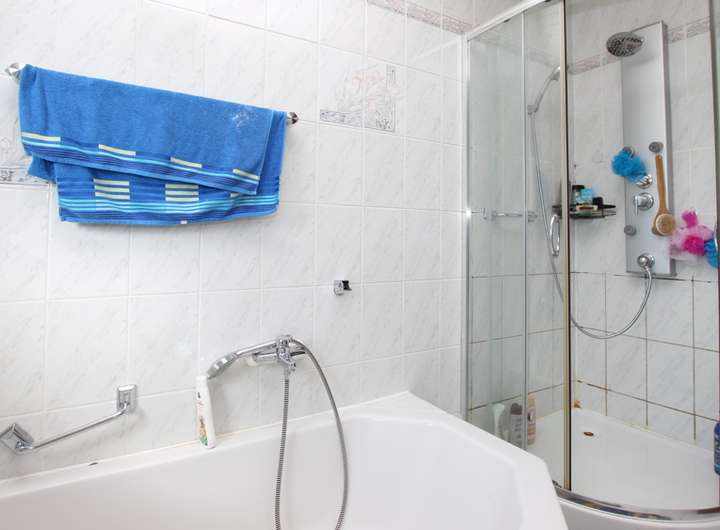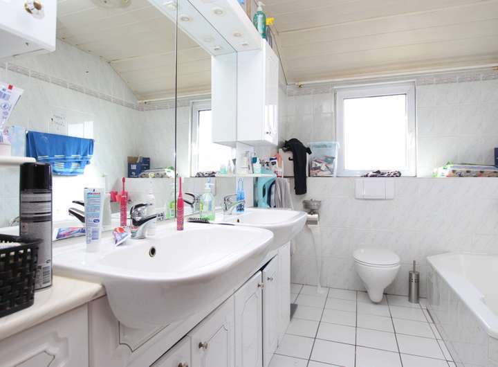 - Bad im Obergeschoss ausgestattet mit Badewanne, Dusche, wandhängendem WC und Doppelwaschbecken (Sanitärobjekte weiß); Wände deckenhoch gefliest (helle Marmoroptik mit Bordüre); Boden gefliest (weiß); Decke vertäfelt (hell)