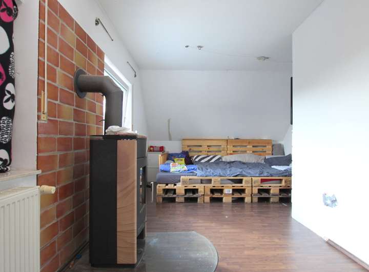 - Kamin im Obergeschoss installiert; Edelstahlschornstein außen