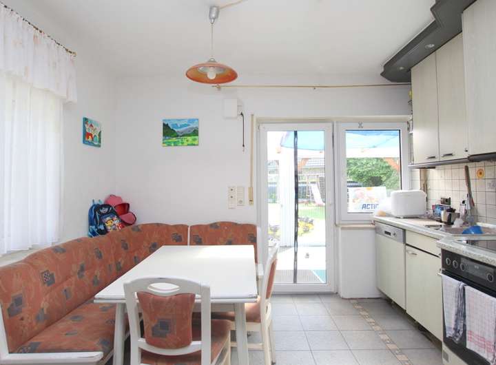 - Küche mit Einbauküche inkl. E-Geräten (Backofen, Herd, Dunstabzugshaube, Spülmaschine, Kühlschrank und Mikrowelle); Fronten aus Holz (grau); diverse Ober- und Unterschränke vorhanden; Fliesenspiegel (grau); Boden gefliest (grau mit Bordüre); Wände mit Strukturtapete belegt (weiß)