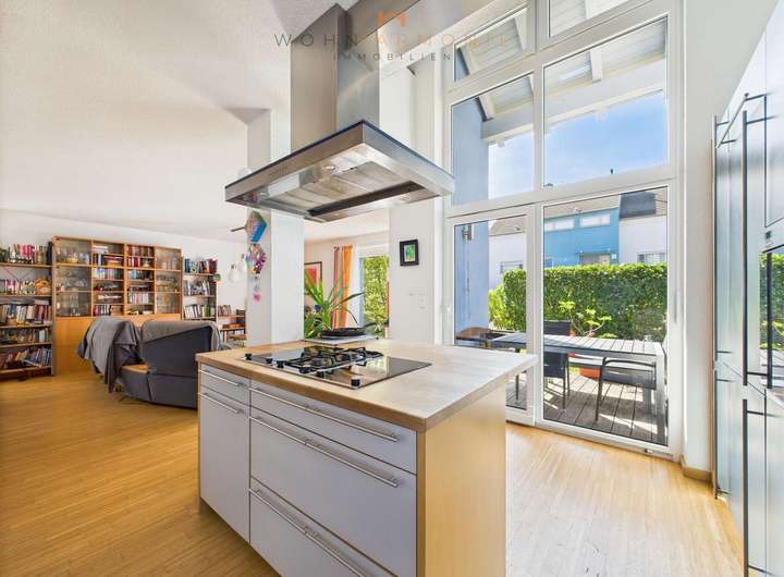 Im Erdgeschoss befindet sich der durch die große Fensterfront lichtdurchflutete Wohn- und Essbereich mit offener Einbauküche und Zugang zur Terrasse und separatem Abstellraum mit bodentiefem Fenster.