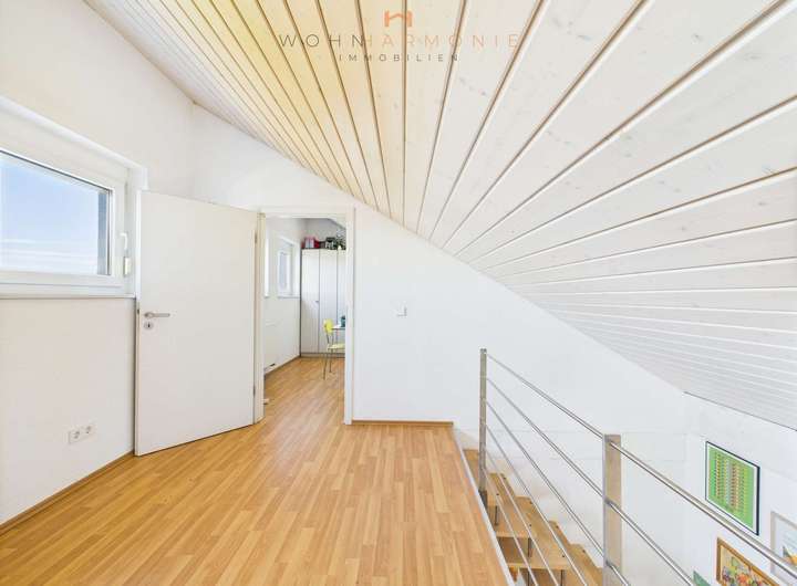 Im Obergeschoss entdecken Sie den Elternbereich mit einem tollen großzügigen Badezimmer en Suite, Schlafzimmer und Ankleide, sowie einen lichtdurchfluteten Arbeitsbereich, von welchem Sie wiederum auf die offene Galerie im Dachgeschoss mit 2 Zimmern gelangen.