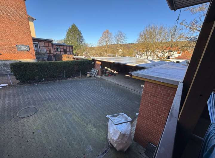 Vor dem Haus gibt es gepflasterte Kundenparkplätze, ebenso Stellplätze im Innenhof, ein Carport und einen großen Werkstatt-oder Lagerraum.